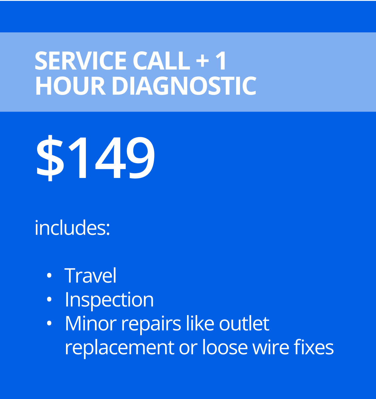 Service Call + 1 Hour Diagnostic: $149 (includes travel, inspection, and minor repairs like outlet replacement or loose wire fixes)