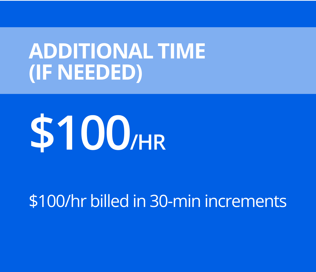 Additional Time (if needed): $100/hr billed in 30-min increments